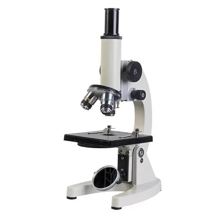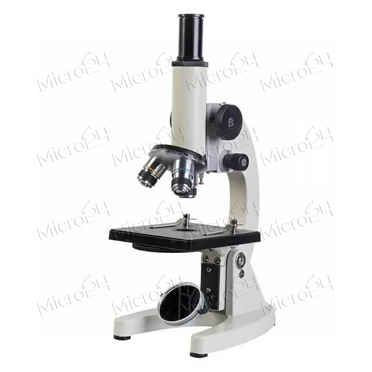 Монокулярный прибор, оснащенный трехпозиционным револьверным объективом на 4x/0,1; 10x/0,25; 40x/0,65. Набор диафрагм дает возможность настроить контрастность изучаемого объекта. Объектив имеет пружинящий механизм, защищающий линзы от механического повреждения при неосторожном нажатии на стекло. Для комфортной работы тубус меняет угол наклона вместе с предметным столиком. В качестве источника света используется зеркало.