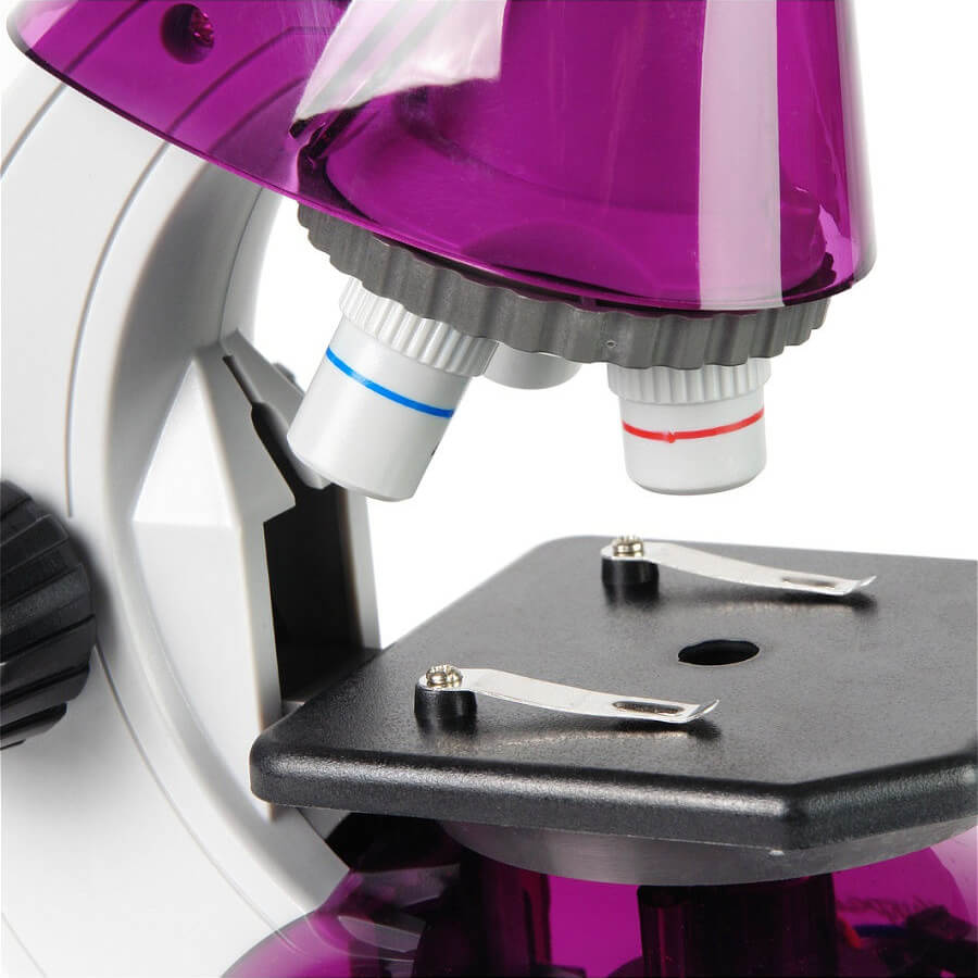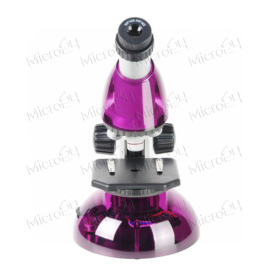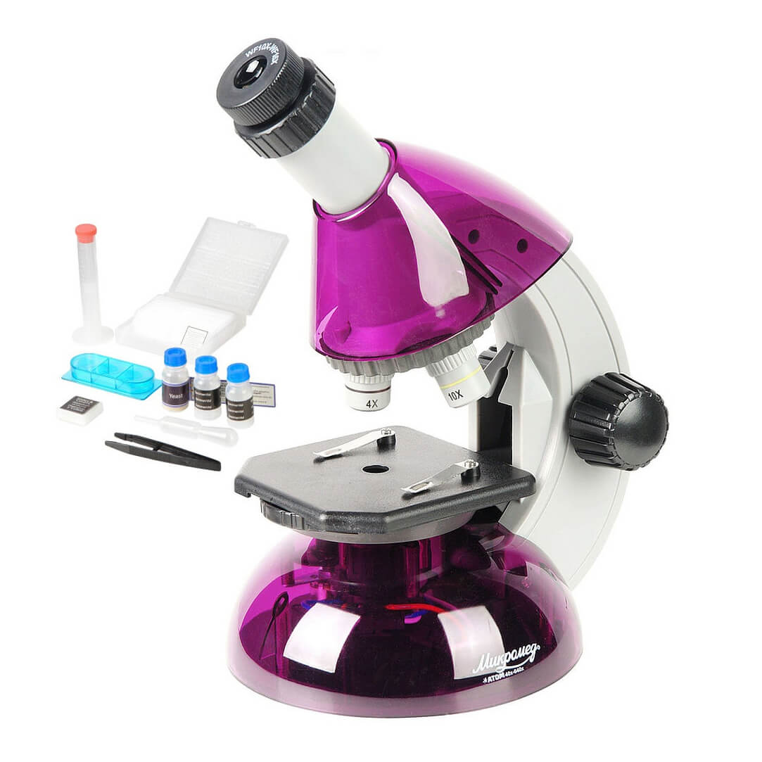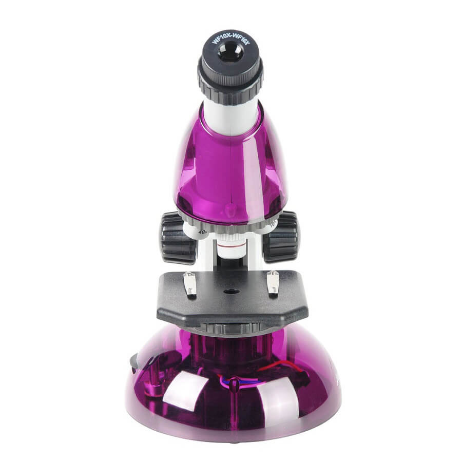Детский оптический прибор с увеличением 40-640х. Оснащен встроенным светодиодным осветителем и круглым предметным столиком с зажимами и набором диафрагм. Фокусировка настраивается с помощью специальных маховиков, благодаря чему контрастность изображения не сбивается от неосторожных движений. Револьверное устройство рассчитано на 3 объектива с увеличением 4, 10, 40х. Питается микроскоп от двух батареек АА. В комплектацию входят предметные и покровные стекла, мензурка с мерными делениями, емкость, наклейки, пинцет, пипетка и флакон.