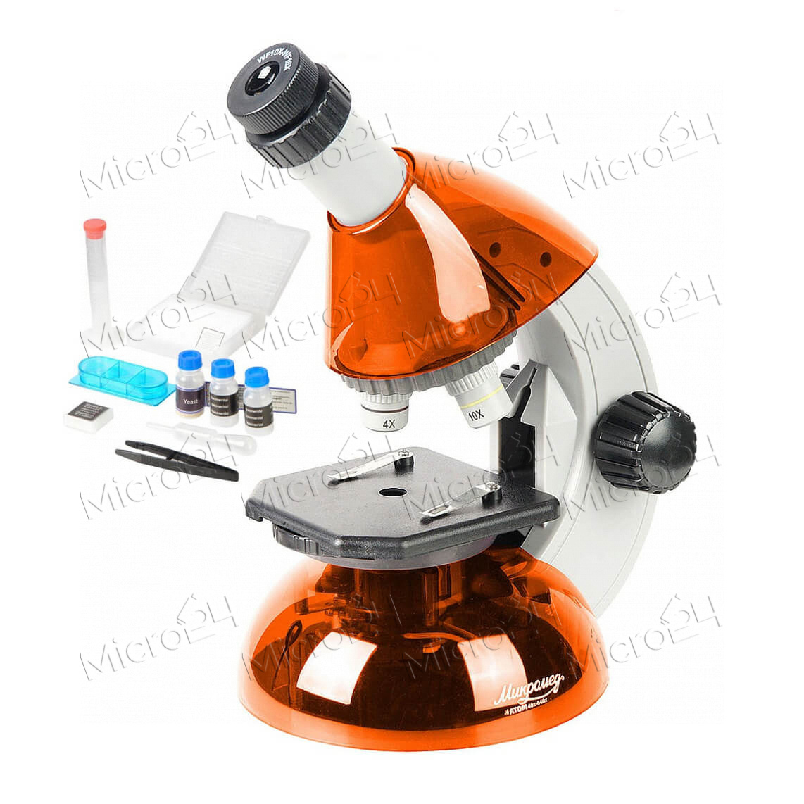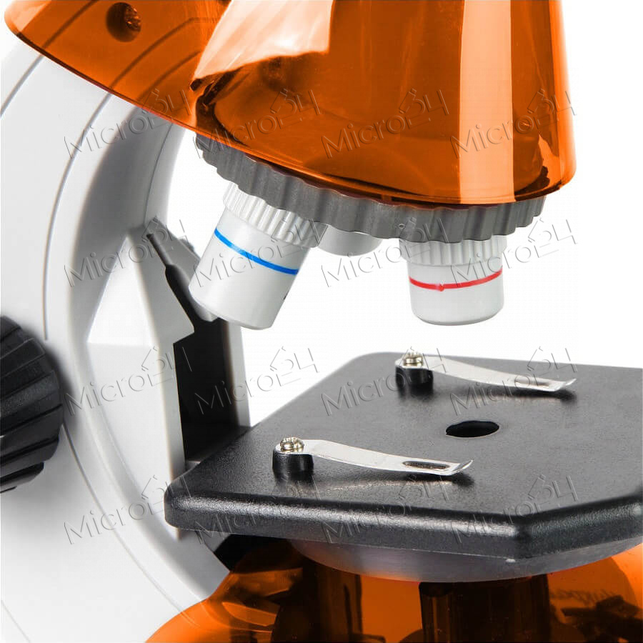 Детский оптический прибор с монокулярной насадкой. Оснащен предметным столиком для опытов с регулируемой светодиодной подсветкой. Дает возможность изучать прозрачные, непрозрачные, сыпучие, жидкие объекты под увеличением до 640 крат. Регулируемый Zoom-окуляр позволяет плавно настраивать масштабирование. Револьверное устройство рассчитано на 3 объектива с увеличением 4, 10, 40х. Питается микроскоп от двух батареек АА. В наборе предусмотрены предметные и покровные стекла для опытов, пипетка, пинцет, наклейки и мензурка.