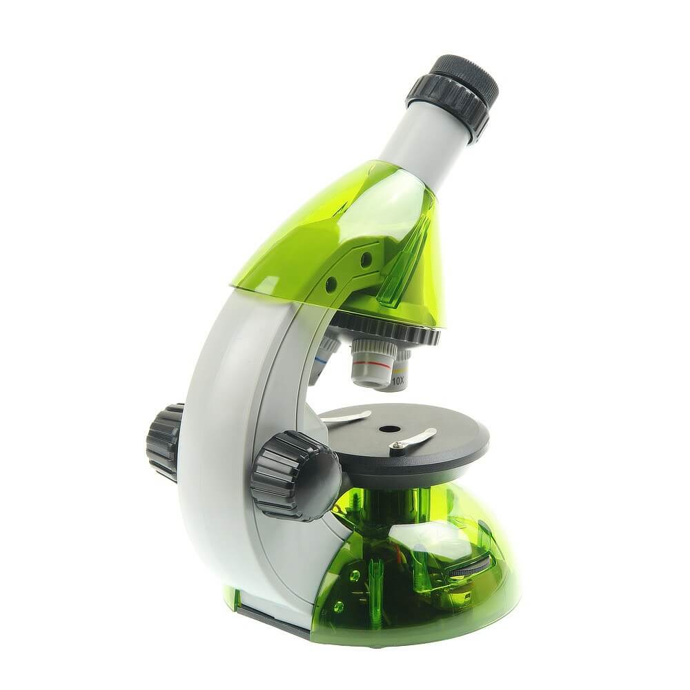 Монокулярный оптический прибор для детей. Используется для изучения прозрачных, непрозрачных, жидких и сыпучих объектов, чешуек и пленок. Предусмотрено три объектива с увеличением 4, 10 и 40 крат. Фокусировка настраивается с помощью специальных маховиков, благодаря чему контрастность изображения не сбивается от неосторожных движений. Есть два режима светодиодной подсветки: сверху и снизу. Предметный столик регулируется по высоте, оснащен зажимами и набором диафрагм. Питается микроскоп от двух батареек АА. В комплектацию входят предметные и покровные стекла, мензурка с мерными делениями, емкость, наклейки, пинцет, пипетка и флакон.